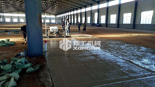 在手扶混凝土攤鋪機整平頭有用的施工范圍內(nèi),首先人工將混凝土初平至比地坪標高高1-2㎝(具體高度依混凝土坍落度而定),然后用手扶混凝土攤鋪機一次性完成振搗、壓實、整平工作。