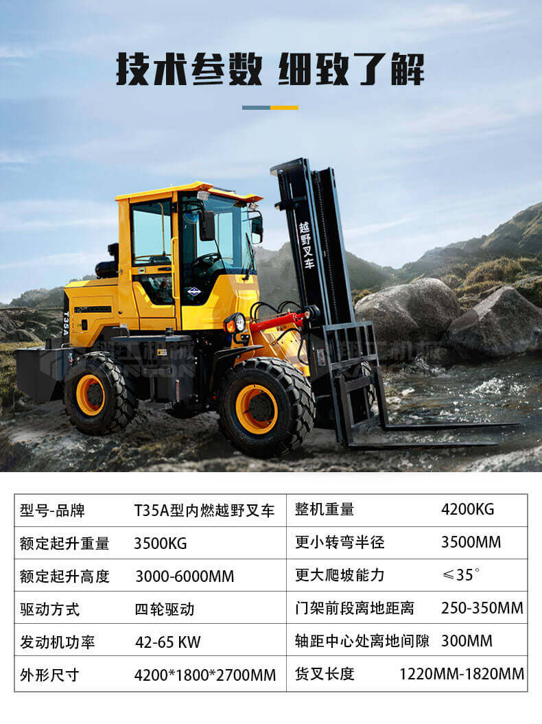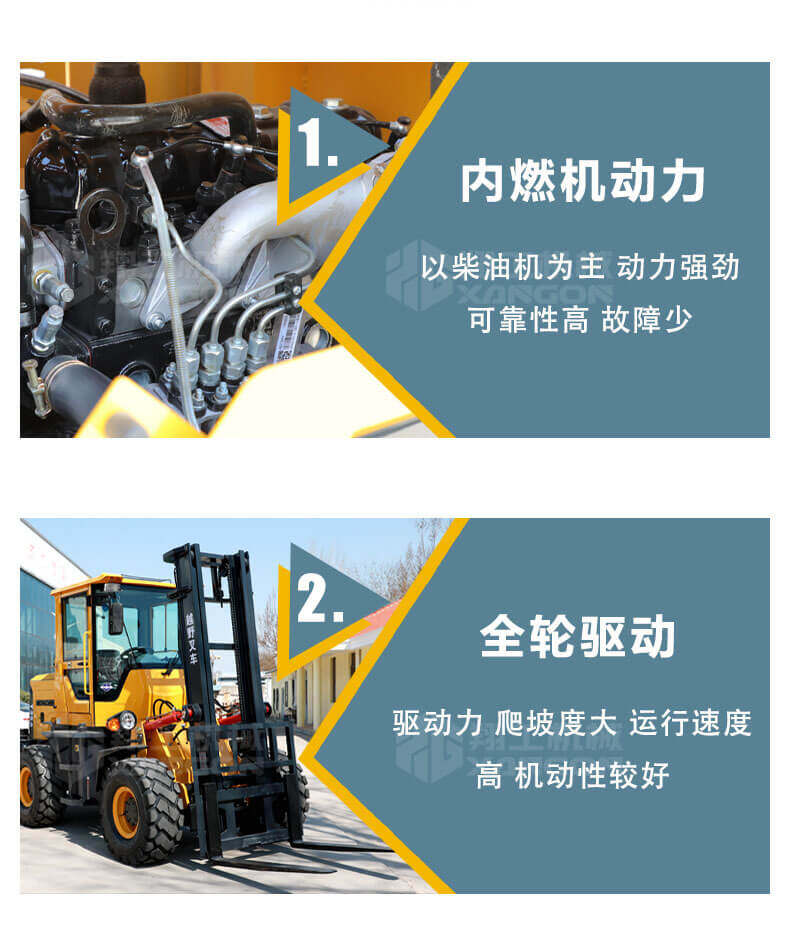 5.越野叉車發(fā)動機功率大,采用全輪驅動和越野輪胎。