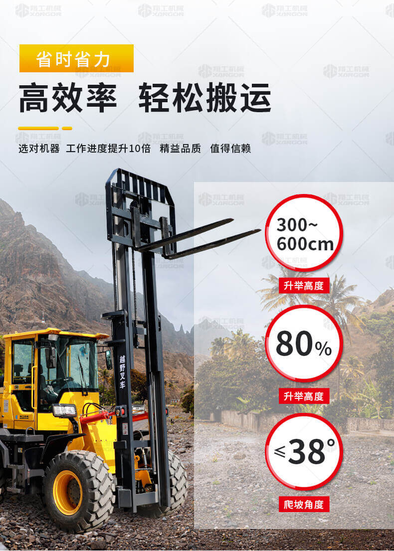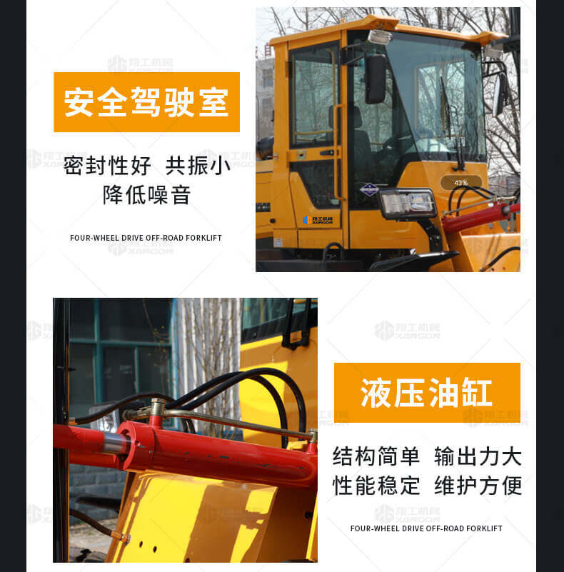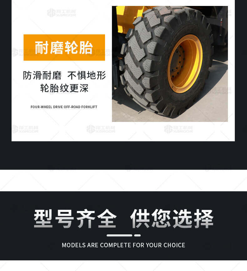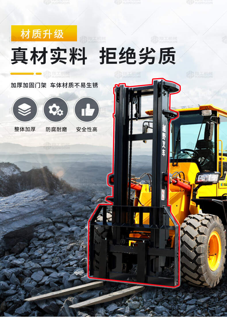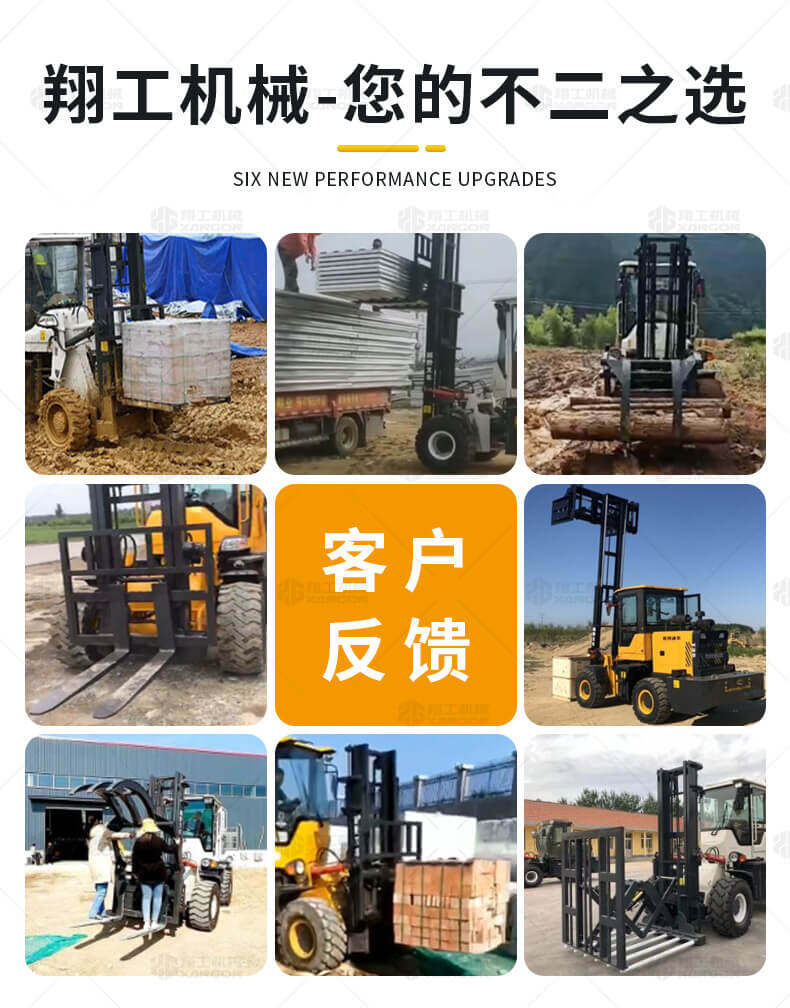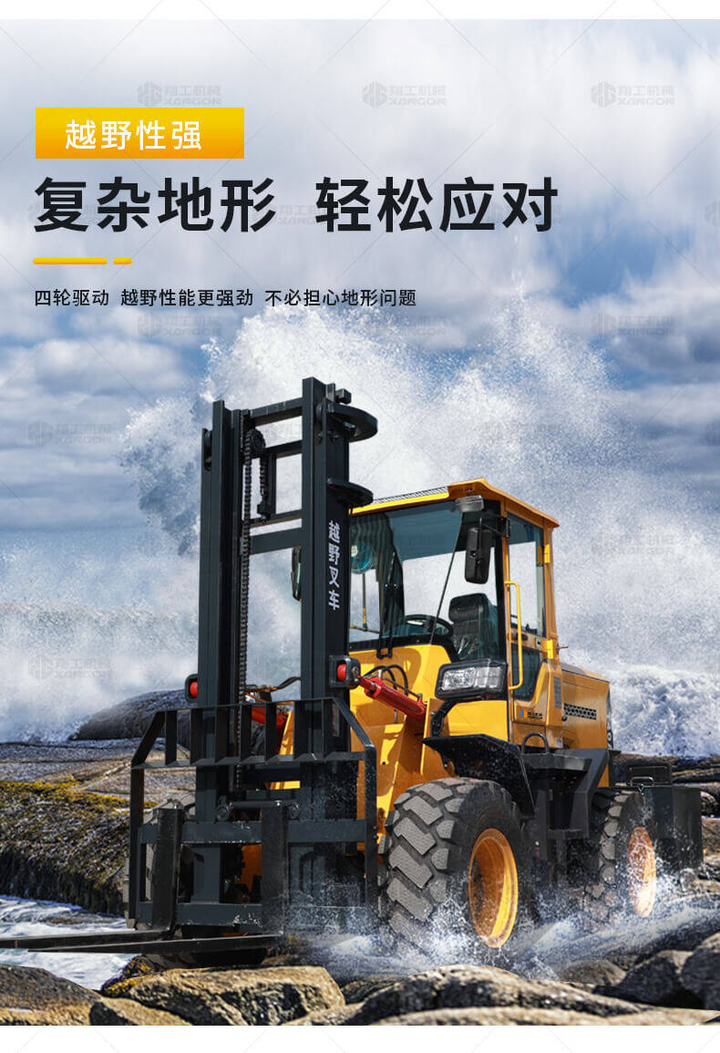 5.越野叉車發(fā)動機功率大,采用全輪驅(qū)動和越野輪胎。