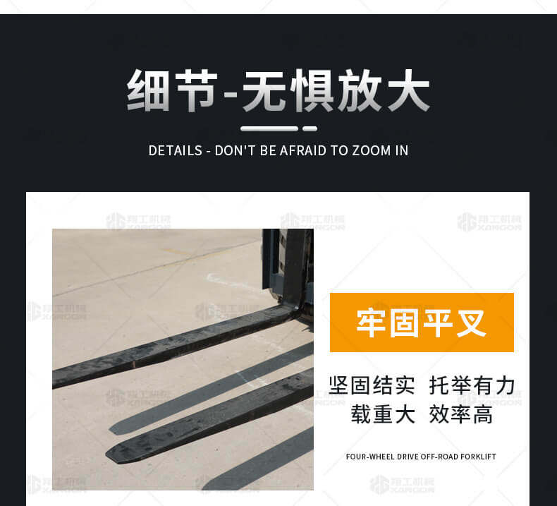 3.普通叉車只能在平整的路面上作業(yè),而越野叉車既可以在普通路面上作業(yè),還可以在山路泥路崎嶇道路作業(yè),輪胎抓地力強,不打滑。